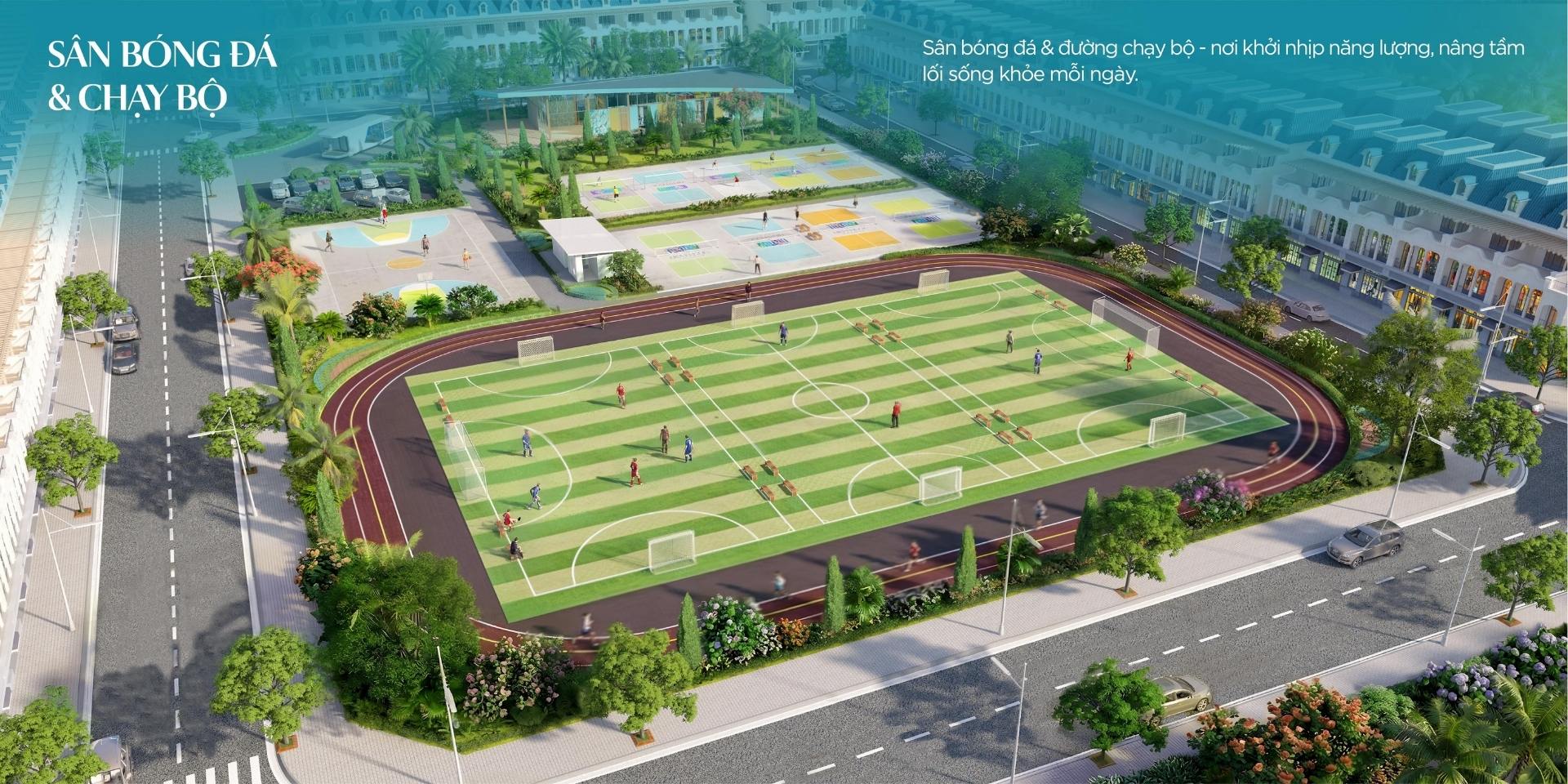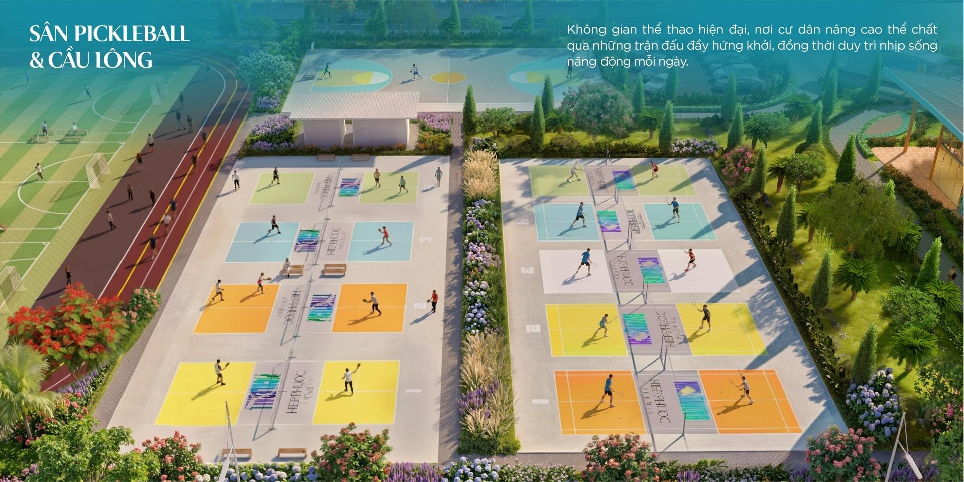 Khu thể thao đa năng: Bao gồm sân tennis, sân cầu lông và khu tập gym ngoài trời.
