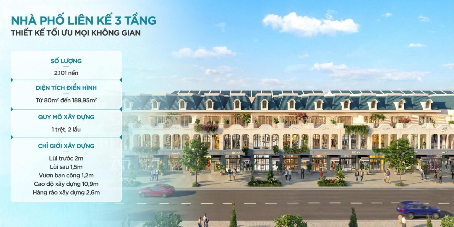 Nhà phố liên kế: Diện tích điển hình từ 80m² – 100m² (5x16m, 5x18m, 5x20m).