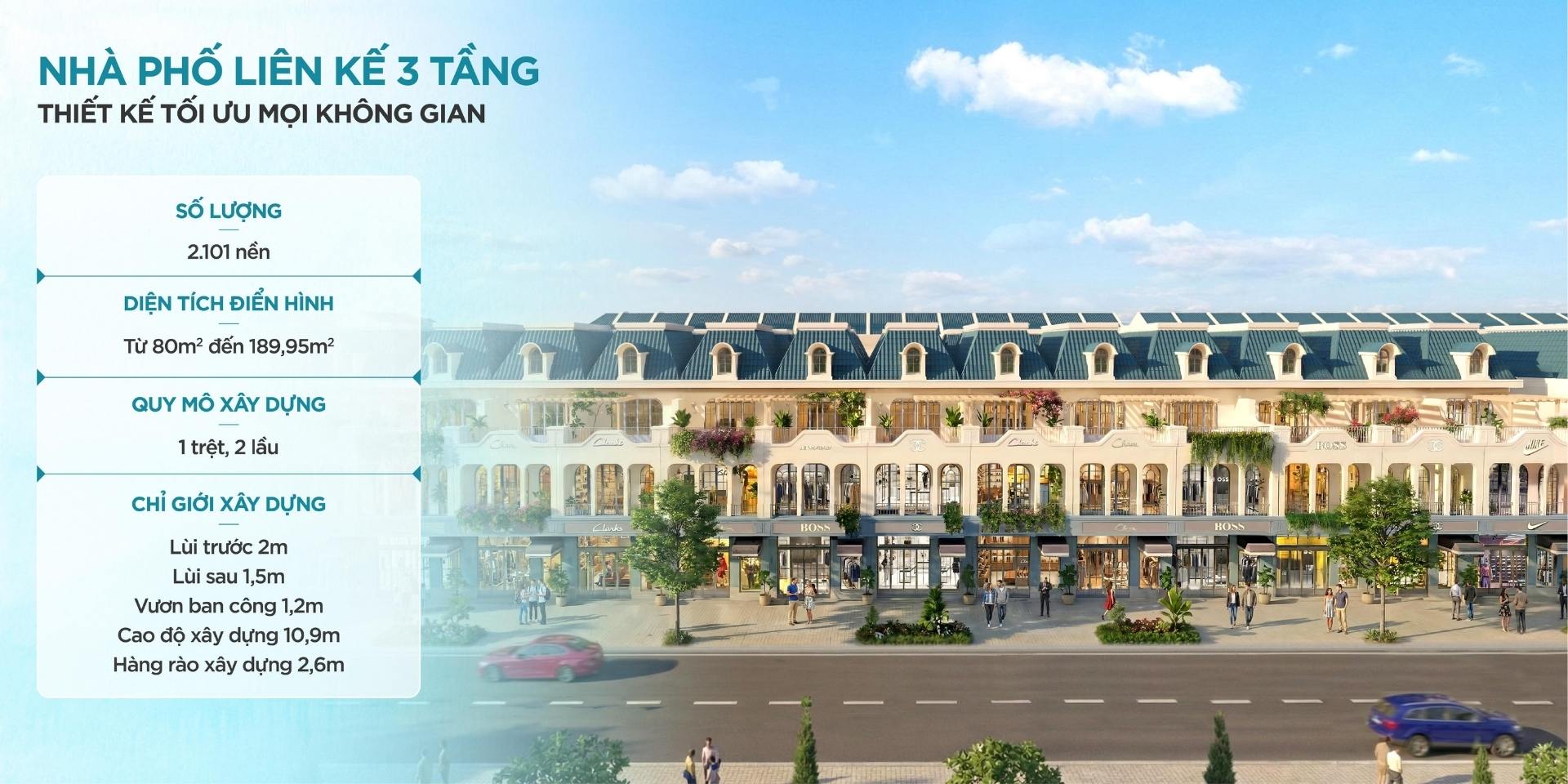 Shophouse: Nằm trên các trục đường lớn (12m – 20m), thuận tiện vừa ở vừa kinh doanh.
